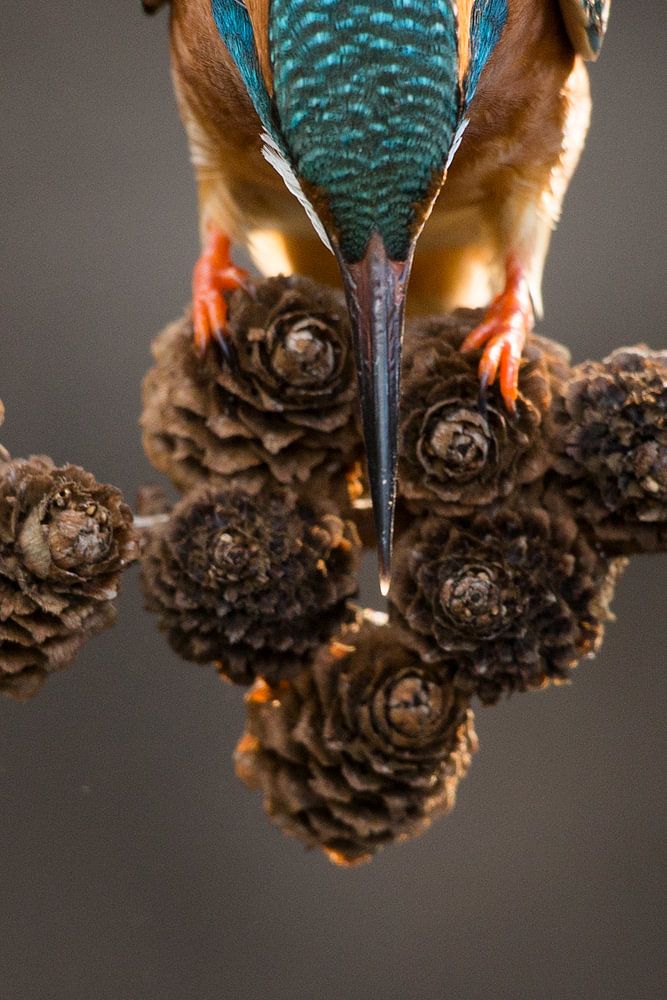 Kingfisher lurking at fish from spruce branch by Jeroen Stel