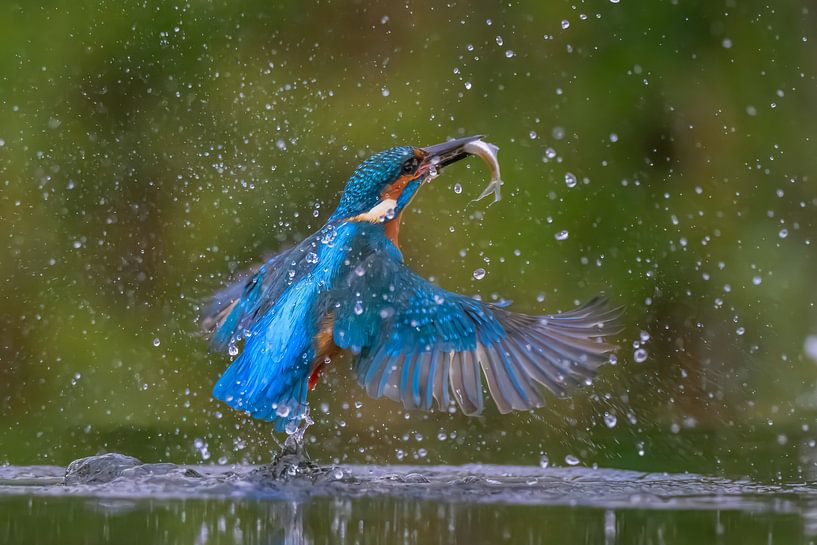 Buy this bird art Kingfisher with fish in action by Lies Bakker on canvas, ArtFrame, poster and wallpaper, printed on demand in high quality.