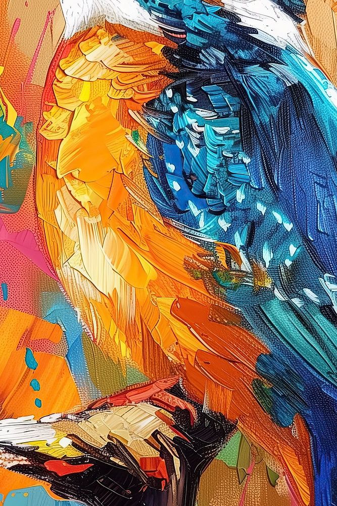 Admire a stunning artwork that captures the elegance of a kingfisher, adorned with vibrant colours, sitting on a branch amid dramatic lighting and detailed elements. This artwork is a masterpiece of fantasy, where the beauty and grace of the kingfisher comes to life in a fairytale setting. The rich colours and high level of detail make this painting truly enchanting, transporting the viewer into a world of wonder and magic. Be seduced by the majesty of the kingfisher, depicted in all its glory in this beautiful artwork.