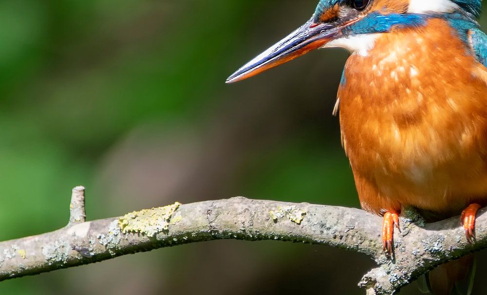 The IJsvogel is doing well in Amsterdam. More and more are being spotted. At this work the IJsvogel can be seen in close-up, sitting on a leaning branch. The background is of a green bouquet.