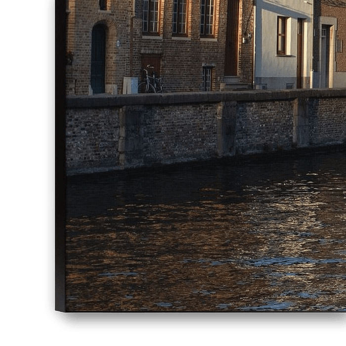 The warm evening light bathes the canals next to Spinolarei, Bruges, Belgium in a mesmerizing glow, casting a picturesque reflection of the charming buildings and bridges on the calm waters. The city's rich history and architectural beauty are beautifully captured in this stunning image, inviting the viewer to wander through the cobblestone streets and immerse themselves in the romantic atmosphere of this enchanting European city.