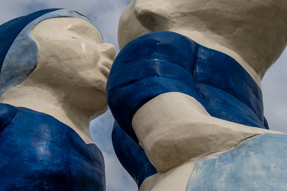 Giant statue of a kissing couple (farmer boy and girl in Delft blue costume) in Westpoort in Amsterdam, The Netherlands