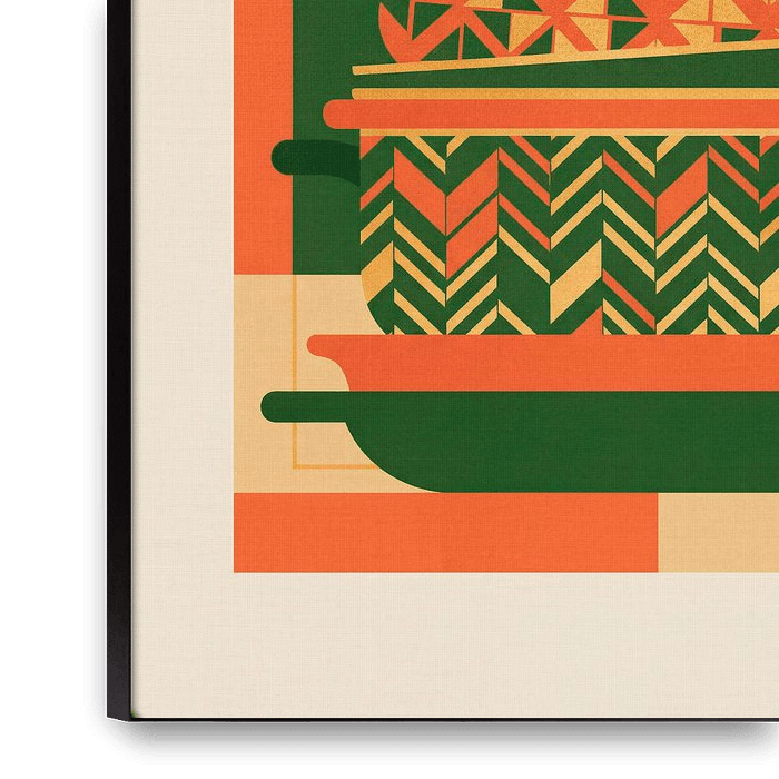 ● Exclusive design for Werk aan de Muur / Art Heroes Give your kitchen an artistic touch with this unique graphic illustration. At the heart of this design is a stack of pans, each decorated with striking geometric patterns and herringbone motifs.