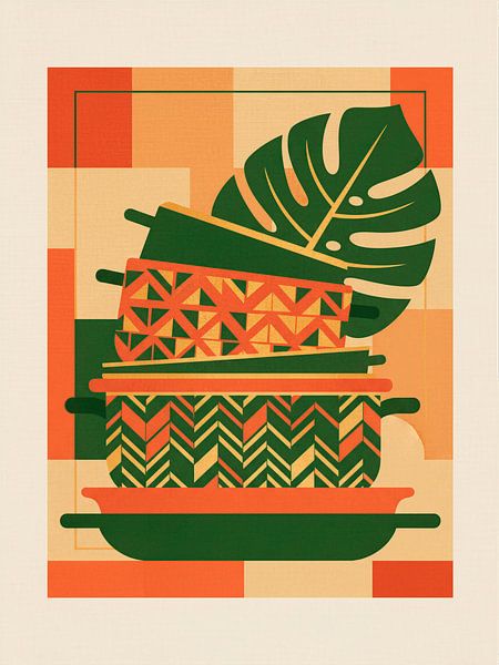 About ‘Kitchen art: Stacked pans with graphic patterns and a monstera leaf’ by STUDIO ARTSY