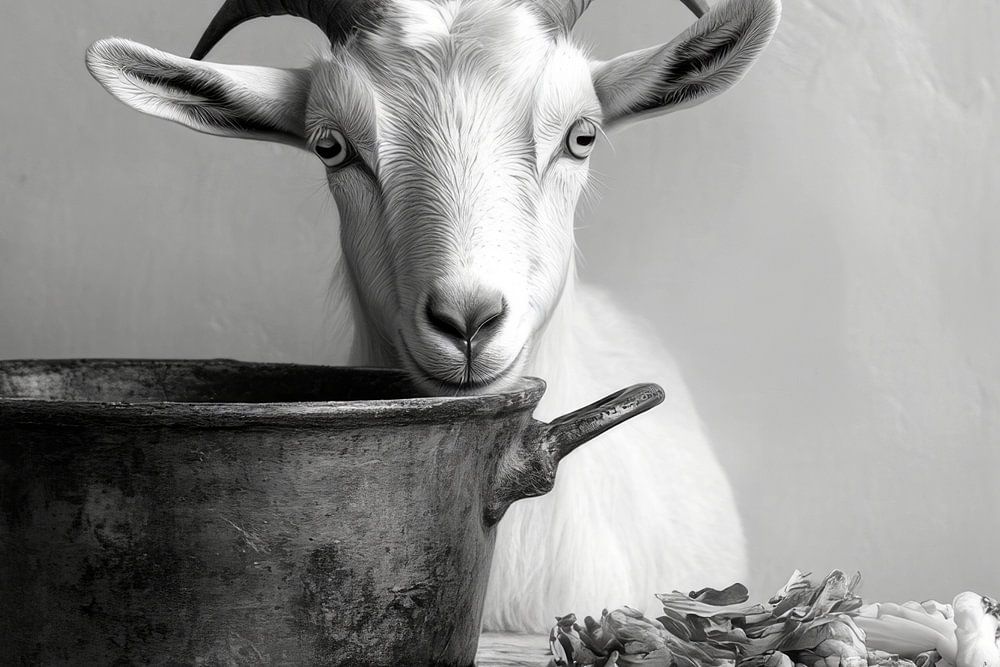 A charming still life made of rustic wood and a mysterious pot, from which curiosity and cosiness radiate. The goat's striking horns add a playful touch to the scene, while fresh ingredients in the foreground hint at the culinary action. This work of art would look wonderful in a modern kitchen and stimulate conversation.