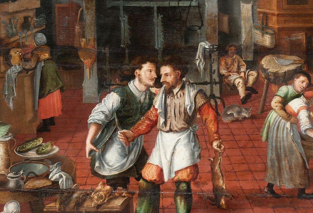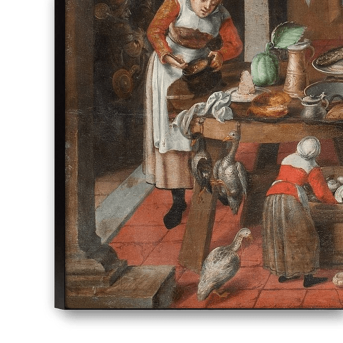 This painting shows an interior view of a larger kitchen with various figures occupied in different tasks. At the center of the composition are two men, the one on the right is about to cut up a rabbit, while the other holds a plate, possibly for assistance. In the left corner of the foreground is a woman stirring a pot, and to the left sits a woman nurcering a child. Behind them is a smaller brawl as one man grabs a woman who is doing the dishes, to the clear annoyment of her fellow dishwashing colleague. In the background, in the upper left corner sits a party of people eating by a table.