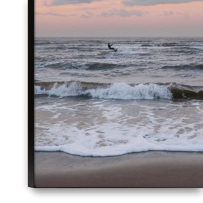 I took this photo in Ouddorp. A silhouette of a kite surfer. With in the background a beautiful sunset showing beautiful pink and orange pastel colors. A real coastal picture, taken from the beach, towards the sea.