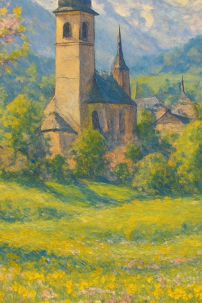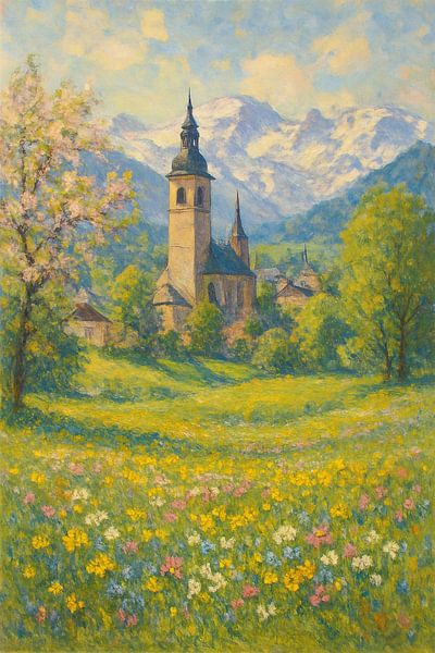 Kitzbühel Church Spring Meadow – Austrian Alps Impressionist Art by Travel Shop