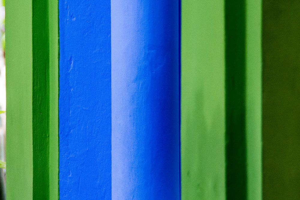 Prachtige kleuren Majorelleblauw en groen in Jardin Majorelle in Marrakesh, Marokko. Het is een botanische tuin ontworpen door de Franse kunstenaar Jacques Majorelle in 1924. Vanaf 1980 was de Majorelletuin eigendom van de in 2008 overleden Franse modeontwerper Yves Saint Laurent en zijn partner Pierre Bergé.