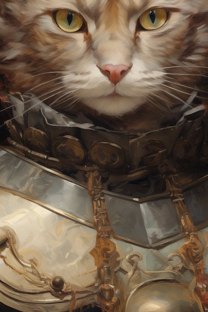 In the deepest shadows of the kingdom, where the boundaries between reality and myth are blurred, stands a feline guardian named Felinus. This image depicts Knight Felinus, a proud and majestic feline warrior of the Secret Court. His eyes, imbued with wisdom and mystery, tell a story of centuries of protecting the kingdom and its secrets.