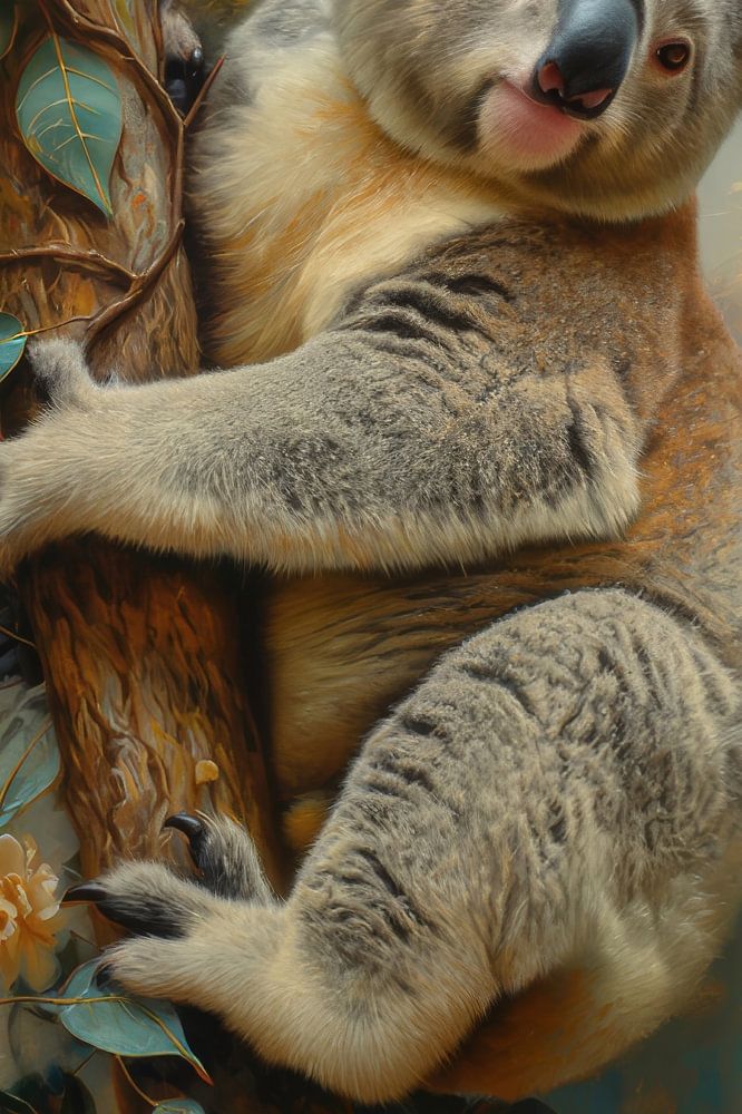 "Koala in Floral" captures the cuteness of a koala snuggled up against a tree trunk, surrounded by an abundance of flowers in soft shades of pink, peach and yellow. The detailed rendering of the koala's fur and delicate blossoms create a harmonious and enchanting composition. The warm colours and dreamy background create a soothing and joyful atmosphere. Ideal for animal and botanical art lovers, this artwork brings a touch of natural beauty and serenity to any room.