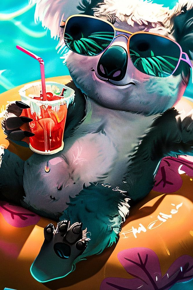 This cheerful and unique image shows a relaxed koala, complete with sunglasses, enjoying a sunny day in a swimming pool. Sitting on a colourful swimming belt, he holds two tropical drinks, while the reflection of the water creates a dynamic play of light and colour. This design exudes a summery, carefree vibe, perfect for brightening up any room. It is an ideal choice for animal lovers or cheerful decorations that bring a smile to the face.