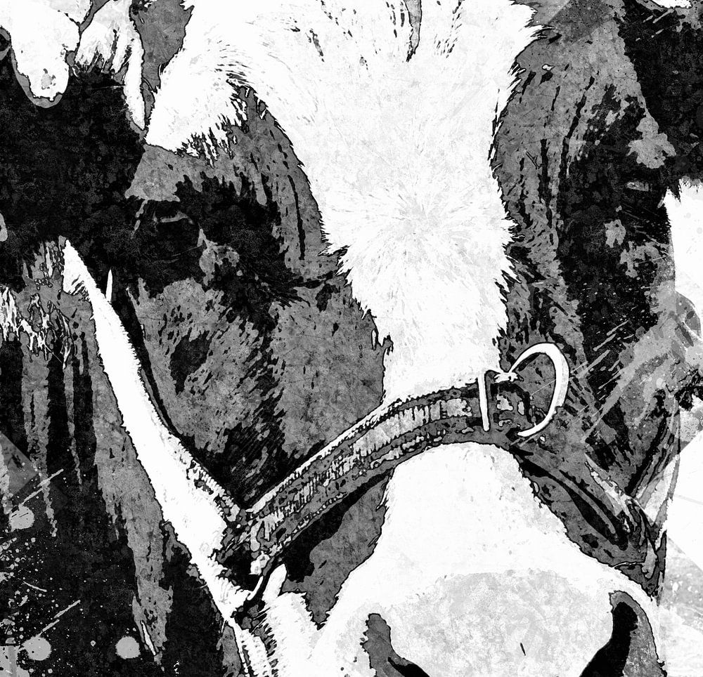 Een abstract en figuratieve afbeelding van een boerderij koe in zwart-wit. Dit werk is gebaseerd op een foto van een koe die ik een keer tijdens een wandeling in de Betuwe heb gemaakt.
