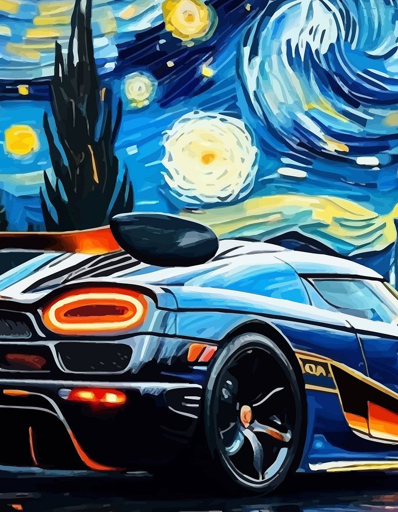 Buy this painting Koenigsegg Agera Starry Night by MIROKKU as a reproduction on canvas, ArtFrame, poster and wallpaper, printed on demand in high quality.