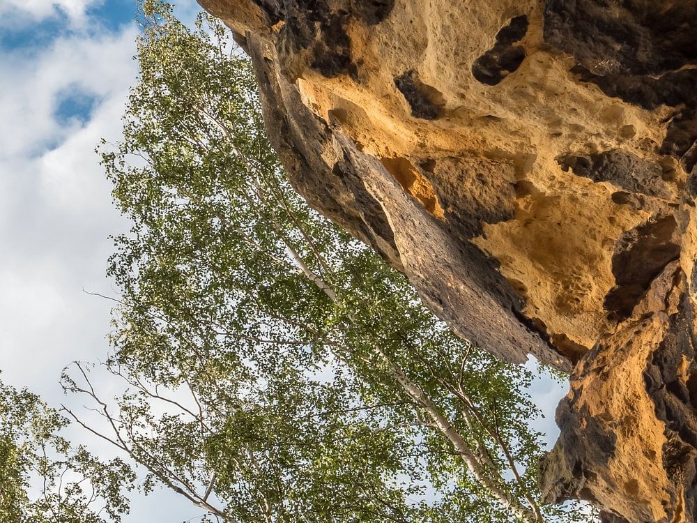 Wenn Sandstein verwittert, das sieht man vielerorts im Dresdner Stadtbild und nicht zuletzt an dessen Wahrzeichen, der Frauenkirche, wird er sprichwörtlich rabenschwarz. Letztlich aber ist nur die äußerste Schicht davon betroffen, wie man im Bild extrem gut sieht. Der Kontrast könnte kaum größer sein zwischen der seit langem Wind und Wetter ausgesetzten Felsoberfläche und dem Gestein, das unter der abgeplatzten Oberfläche zutage tritt.