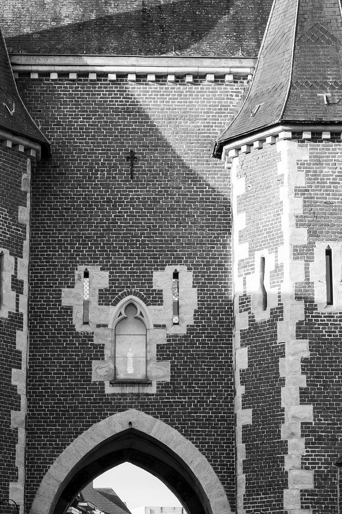 View of the 'Koepoort' in Ninove, East Flanders, Belgium, catching the early morning winter sun. The 15th century building is the only remaining city gate house in the town, and is a well known historic landmark in the Denderstreek.