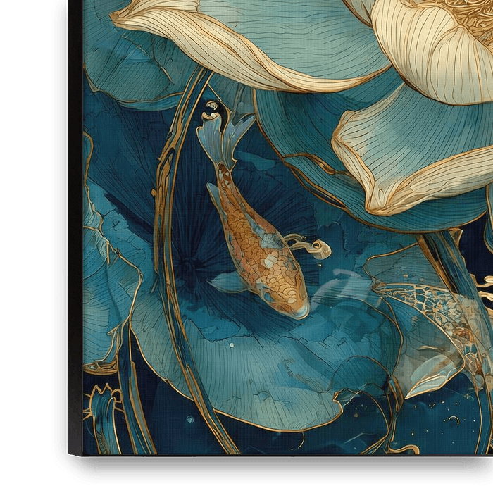 A highly textured artwork featuring a large, cream and turquoise lotus bloom surrounded by swirling foliage and two small, brightly colored orange koi fish against a dark, deep blue background.