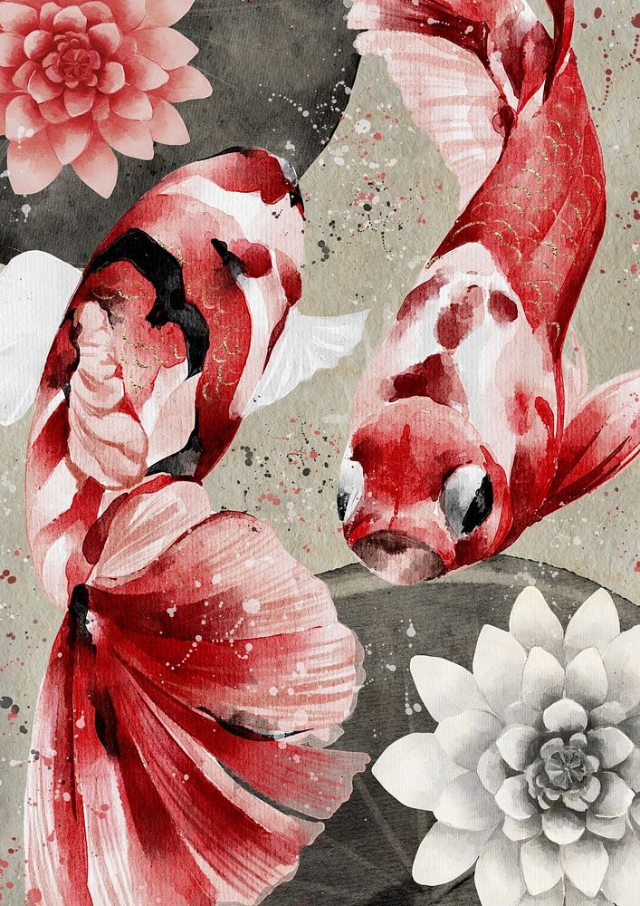 Buy this painting Koi in the lotus pond by Lucia as a reproduction on canvas, ArtFrame, poster and wallpaper, printed on demand in high quality.