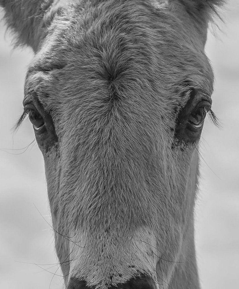 Portrait of a wild Konik foal in black and white, in nature reserve Oostvaardersplassen in the province of Flevoland in the Netherlands.
