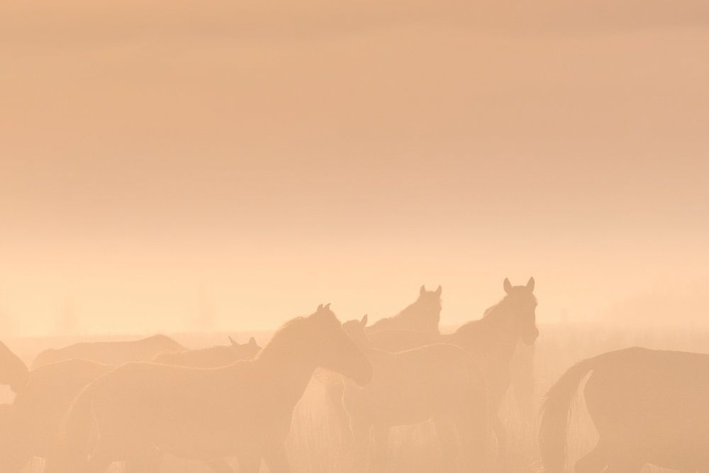 Konik horses in the fog on a beautiful foggy spring morning in the national park Lauwersmeer by Bas Meelker