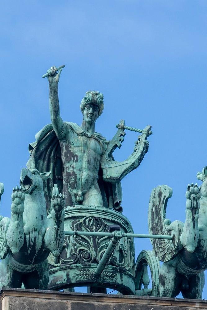Karl Friedrich Schinkel designed a temple to Apollo, the god of fine arts, with the then playhouse. Above the main front he is enthroned in a chariot pulled by two griffins.