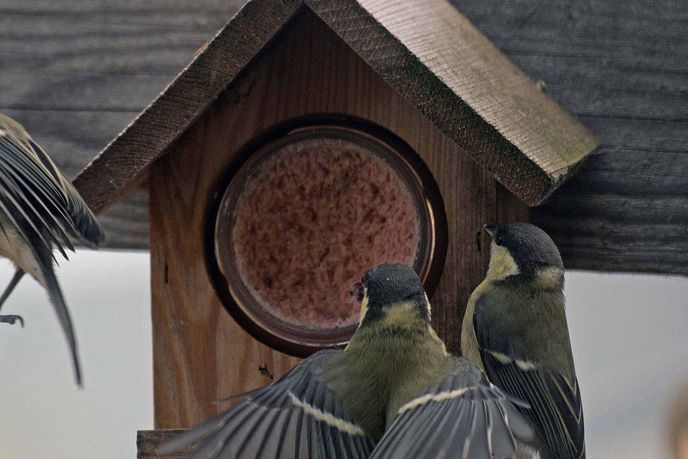 Ouders met jong aan het snoepen van de vogelpindakaas