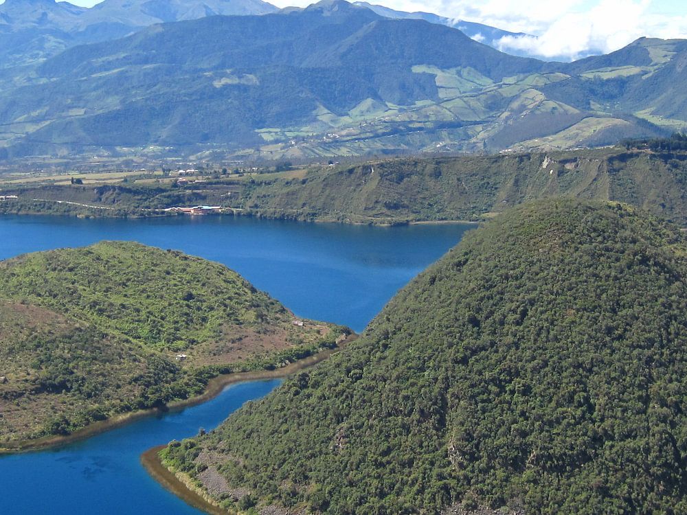 Uitzicht op eilandjes in het kratermeer Cuicocha in de omgeving van Otavola in Ecuador