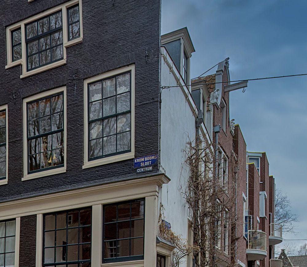 Beautiful corner building with a clock façade on the ancient Kromboomsloot in Amsterdam center.