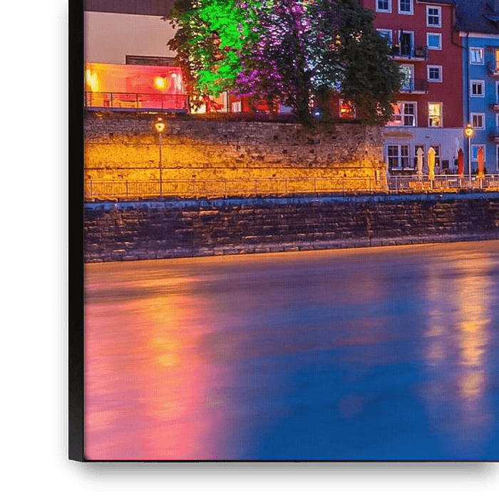 Cityscape of Kufstein with the Innpromenade, the old town and the fortress Kufstein at night, Tyrol, Austria
