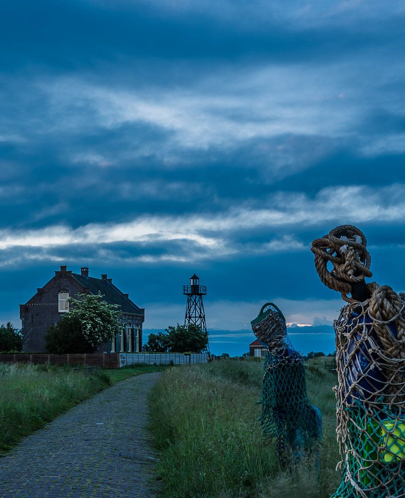 Kunst op schokland het Unesco werelderfgoed. Blik op de vuurtoren van de oude haven van Schokland.