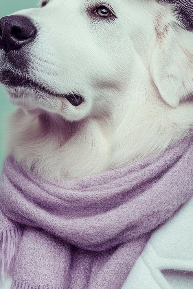 With a majestic bearing and a touch of elegance, this Kuvasz shines in a stylish outfit. His gleaming white fur and smart hat lend him an aristocratic charm, while the fluffy scarf completes a carefree, wintery look. A truly remarkable sight that combines friendliness and self-confidence.