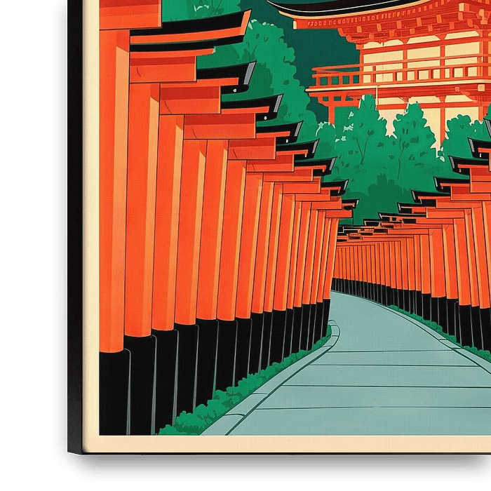 A harmonious scene unfolds, in which bright red torii wind their way through a picturesque landscape and point the way to a majestic temple. Above them, the sky shimmers in soft shades of blue and green. Kyoto shines in traditional splendour, surrounded by lush greenery that envelops Japan's cultural treasures. A dream of aesthetics and…