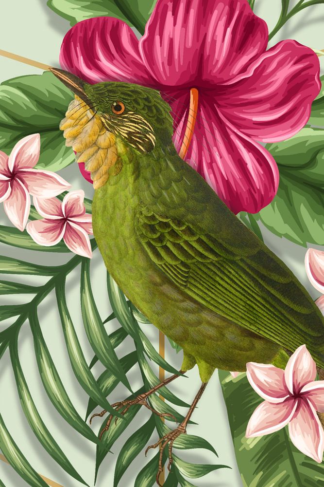 Together they form a romantic and tropical portrait of a beautiful bird.