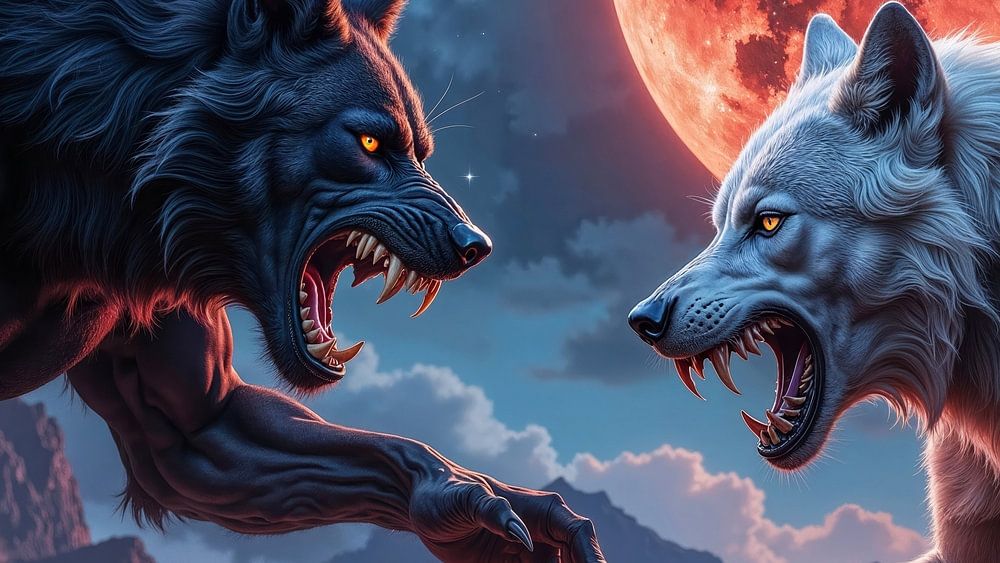 On rocky ground, two werewolves face each other, bodies tense, jaws open in aggression. The dark werewolf emerges from the shadows, while its pale counterpart is illuminated by moonlight. Above them, a blood-red full moon dominates the night sky.