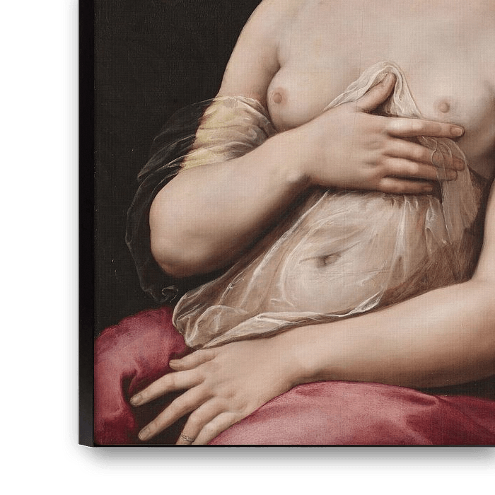 The subject of this portrait, according to tradition, was Raphael’s inspirational muse and mistress: Margherita Luti, the daughter of a baker in Trastevere, hence known as “Fornarina.” There is no record of any commission for the work, which supports the conjecture that Raphael painted it for himself in the last years of his life.