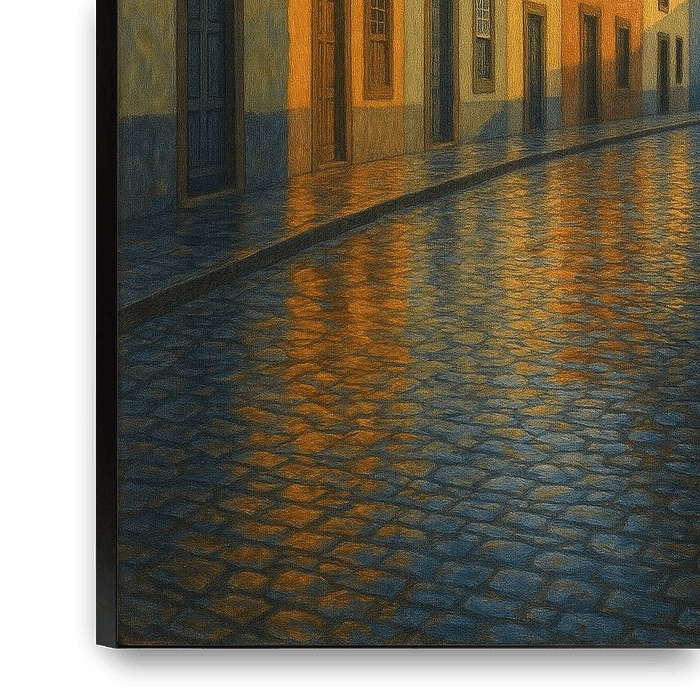 La Laguna Golden Hour captures the enchanting calm of Tenerife’s historic city as sunlight melts into soft amber tones across the cobblestones. The tall bell tower rises gracefully above a row of colorful colonial houses, their pastel façades glowing under the fading warmth of day. Reflections shimmer in the damp street, echoing the…