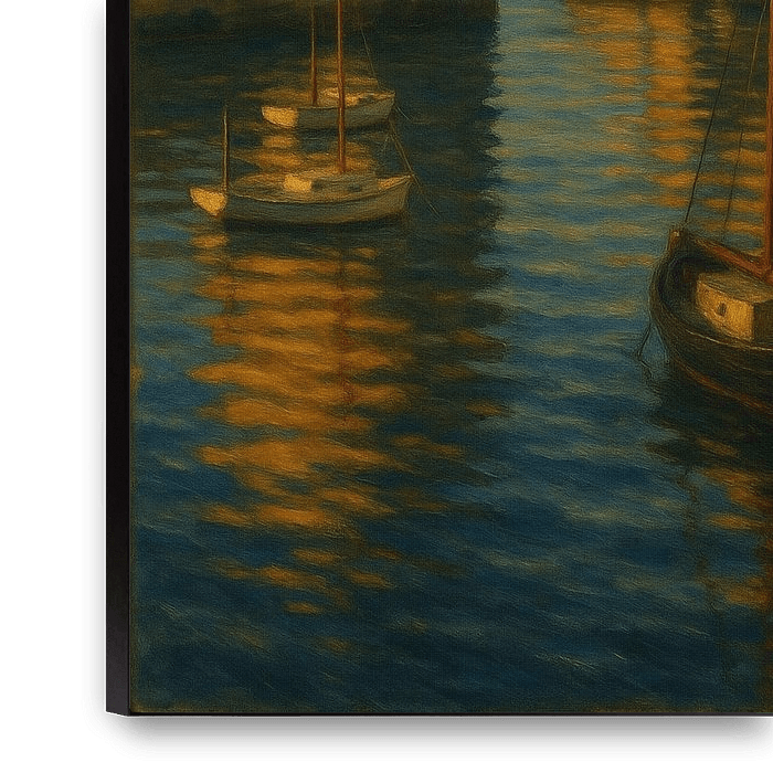 La Rochelle Serenity portrays the twin towers of the old harbor bathed in the honeyed light of early evening. Boats rest quietly in the still water, their masts drawing delicate lines against a pastel sky. The reflections ripple gently, blending gold, blue, and sienna into a tranquil rhythm of color and calm.