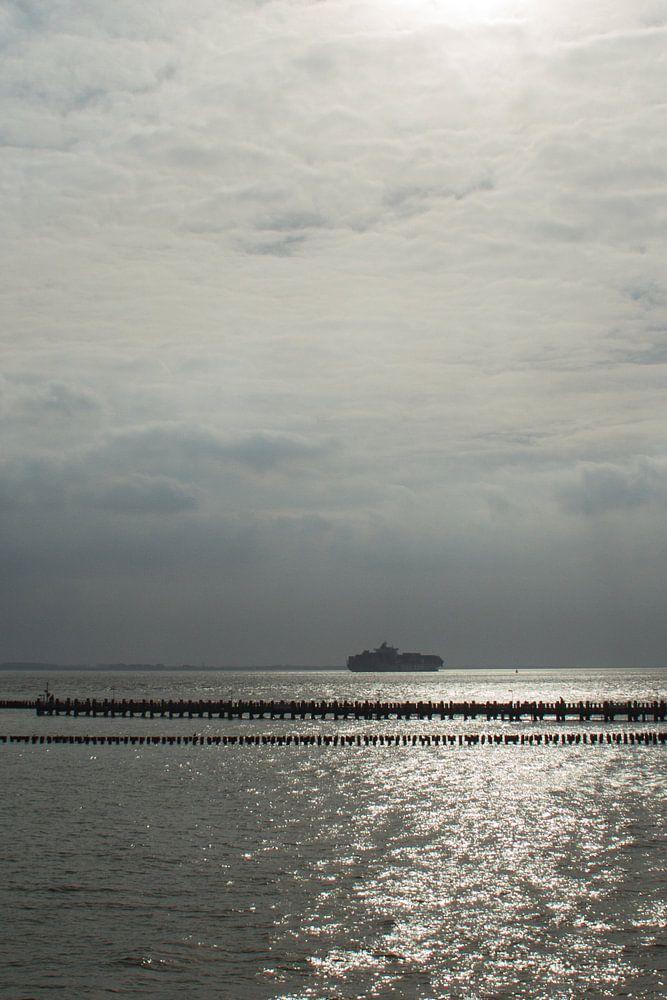 De zon schijnt mooi over de Westerschelde en toont onderwerpen als een silhouet. De wolken geven een romantische sfeer.