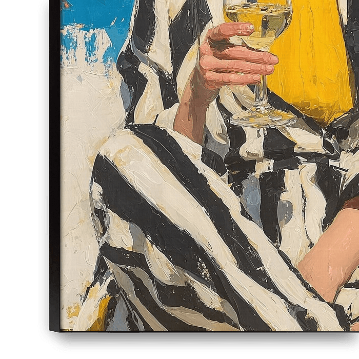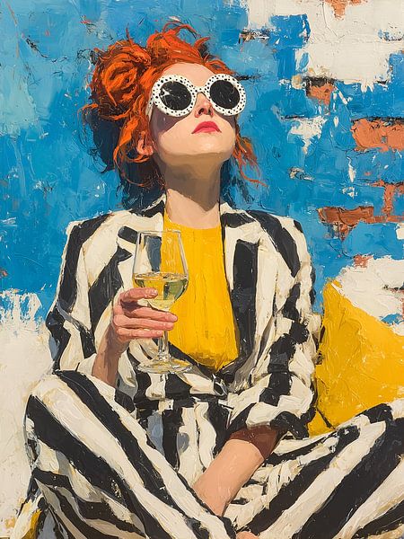 A confident woman enjoys a quiet moment with a glass of wine, captured in a striking interplay of colour and contrast. The combination of warm yellow, deep blue and graphic black-and-white patterns creates an image that immediately catches the eye. The loose brushstrokes and rich texture give the work a lively, almost tangible…