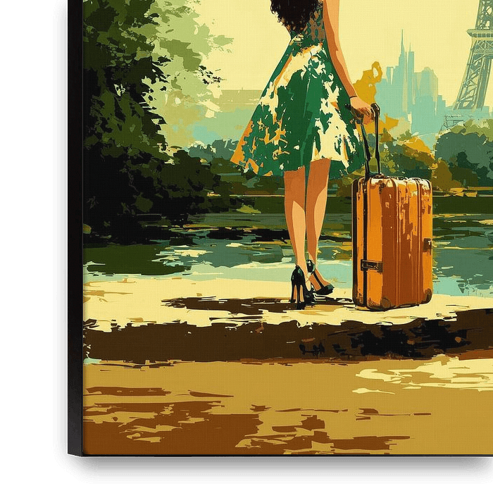 This vintage-inspired work shows a woman looking out over Paris, with the Eiffel Tower as a recognisable centrepiece in the distance. A retro 'Emily in Paris'. The composition is clear and classically constructed: the figure is in the foreground, slightly turned away from the viewer, while city and landscape gradually open up towards…