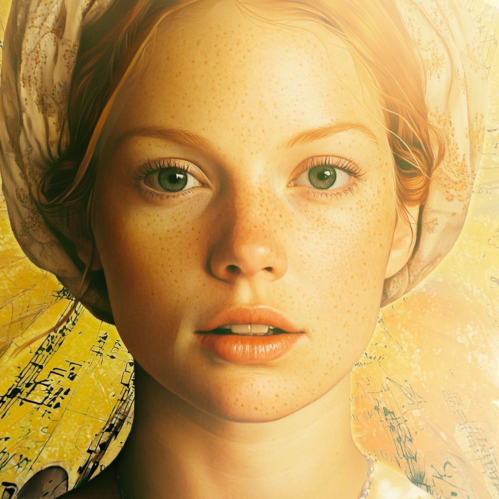 A lady who looks straight at you with an open, innocent expression on her face. Her red hair is pinned up, half sticking out from under the layers of her hat. She is standing in full sunlight, which means the light is coming from one side. The light will warm her with the heat of the summer sun. The musical notes tell us that music is…