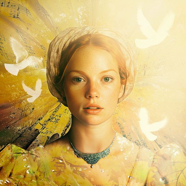 Buy this portrait Lady with musical notes and pigeons by Helga Blanke on canvas, ArtFrame, poster and wallpaper, printed on demand in high quality.