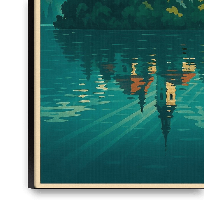 Buy this landscape artwork Lake Bled Slovenia Vintage Travel Poster by Travel Shop on canvas, ArtFrame, poster and wallpaper, printed on demand in high quality.