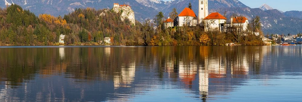 Panoramic picture of Lake Bled on a sunny autumn afternoon.