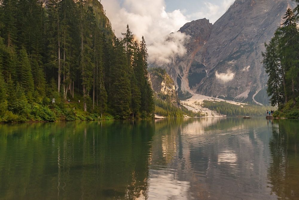 Lago di Braies the mountain lake in the Dolomites. It is surrounded by the mountains and the color of the very cold water is beautiful turquoise.