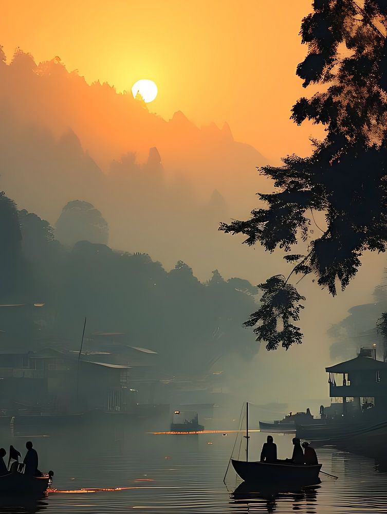 The atmosphere is mysterious as the sun hides behind a thick layer of fog that slowly rises from the calm waters of the sea. In this enchanting morning mist, small fishing boats sail, led by sturdy fishermen adept at their craft. The contours of the boats fade into the mist, while the sound of lapping water and oars are the only clues to their presence. It almost seems as if this scene came straight out of a dream, where the world is shrouded in a soft veil of mystery.