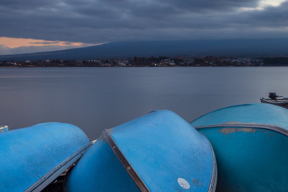 Lake Kawaguchi at sunset with the Fuji volcano shrouded in dark clouds, in Japan. Taken in autumn