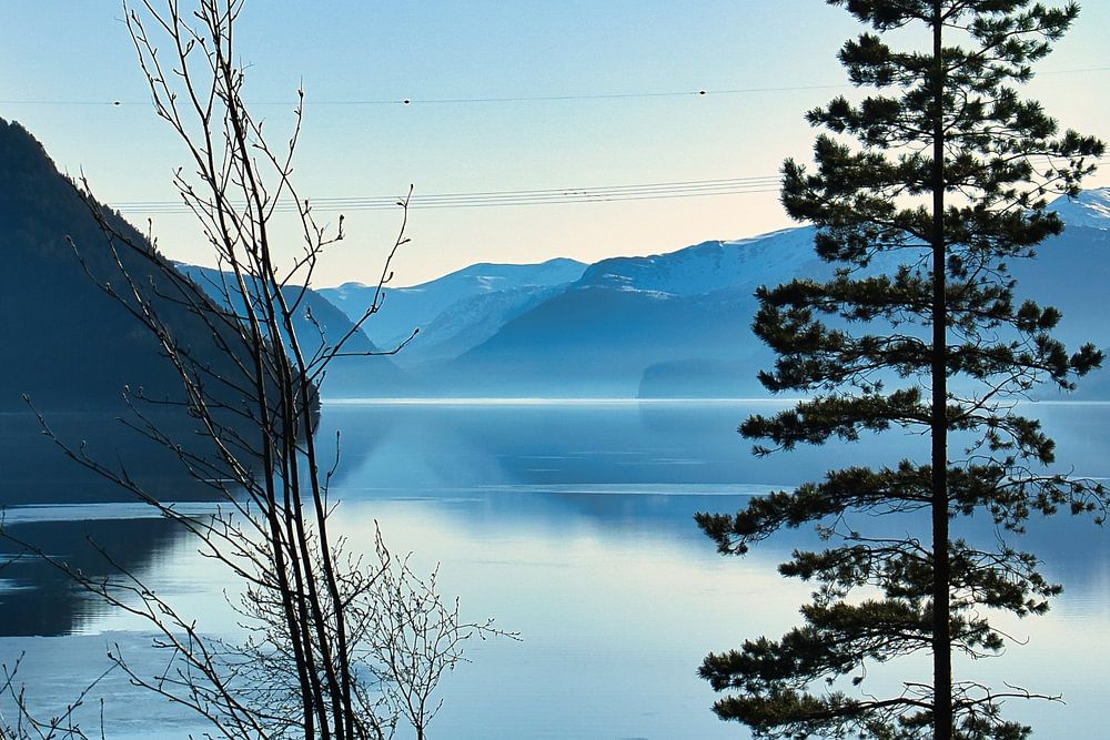 About "Lake Oppstrynsvatnet in Norway in the morning hours."