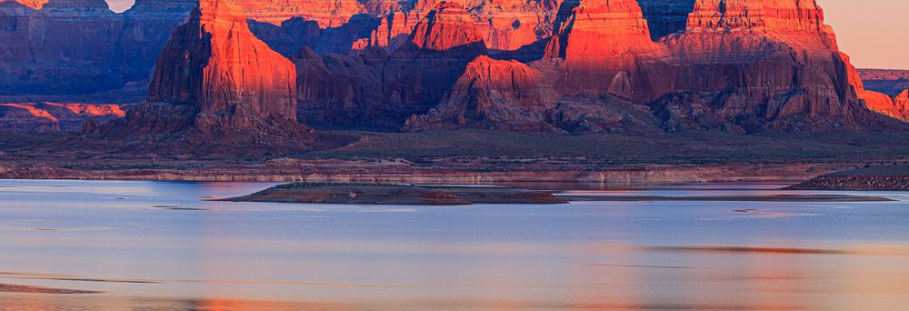 View over the Padre Bay at sunrise as seen from Cookie Jar Butte on Lake Powell, on the border between Utah and Arizona, United States.