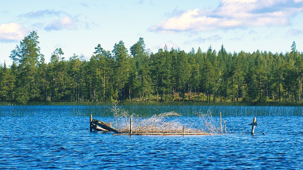 About "Lake in Sweden with white clouds, blue water and trees on the shore"